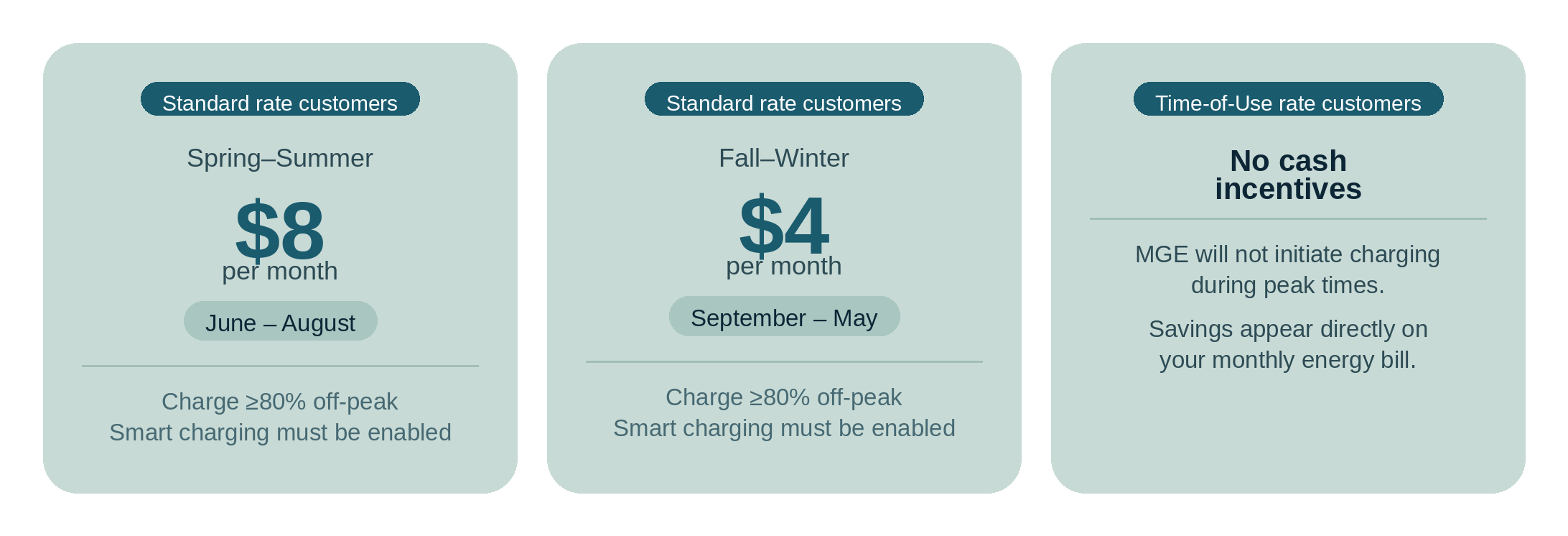 If you are on MGE's standard rate and shift at least 80% of your monthly charging to off-peak hours, you will receive a monthly reward for participating in Charge Ahead. Rewards will be paid monthly at a rate of $8 per month for June through August and $4 per month for September through May. These rewards will be paid out on a monthly basis via Paypal or Venmo. You will be able to enter your Paypal or Venmo information through the ev.energy app. In order to qualify for monthly rewards, you must have smart charging enabled within the ev.energy app and must not perform more than three “unmanaged” (non-smart) at-home charging sessions per month.
